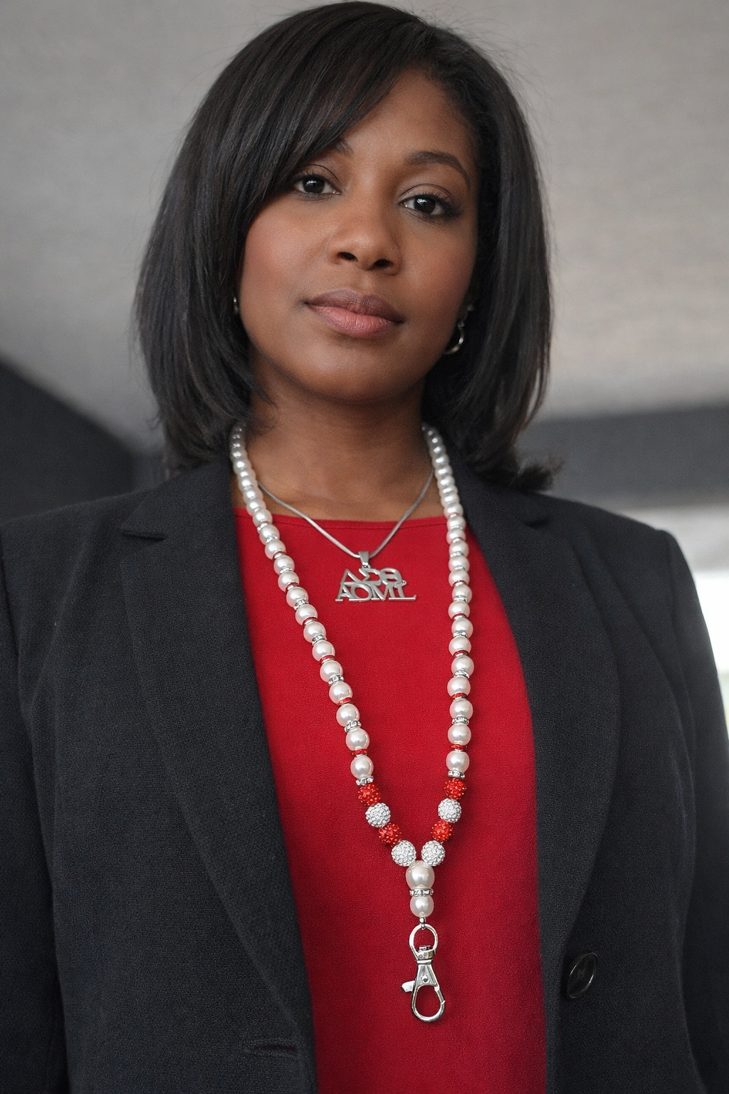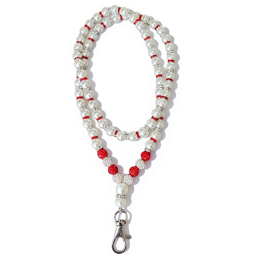 Pearl & beaded badge lanyard with a 15” drop. Features pearls, red & clear crystal-style accent beads as well as clustered crystal beads near the clasp. Finished with a lobster hook to secure badge or keys.