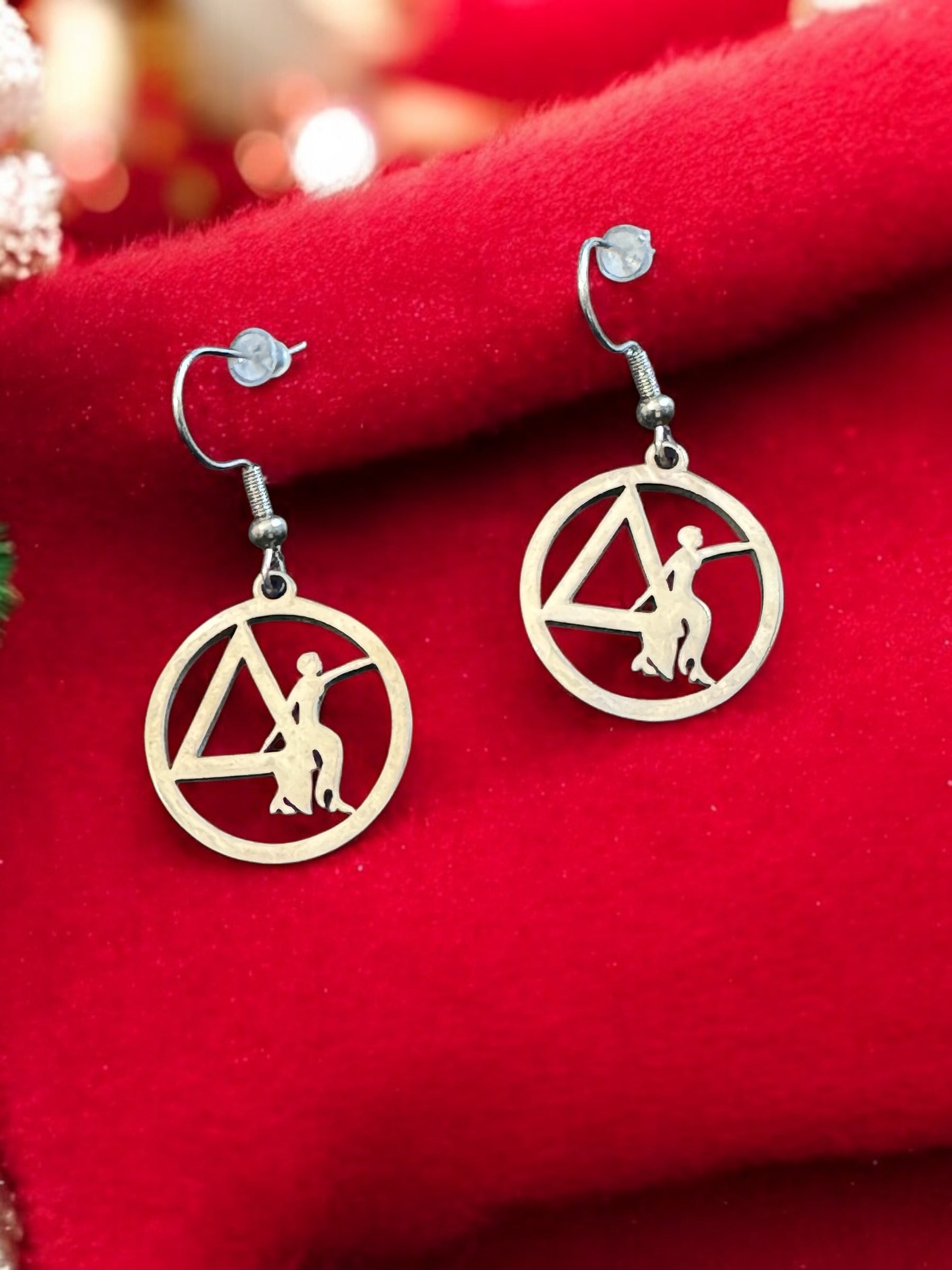 The Pyramid and Fortitude encompassed in a circle, made with stainless steel. Fish hook earring is approximately the size of a penny.